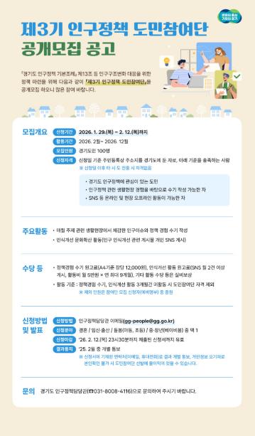 [뉴스앤톡] 경기도가 정책 대상자가 직접 정책개선에 참여하는 ‘제3기 인구정책 도민참여단’ 100명을 공개 모집한다.