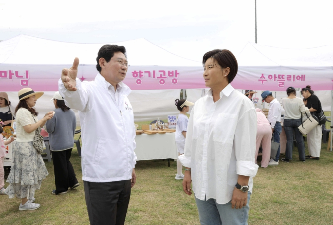| ▲ 이상일 용인특례시장(왼쪽)이 19일 SERI PAK with 용인에서 열린 '북적북적 페스타'에 참석해 박세리 감독(오른쪽)과 함께 행사 현장을 둘러보고 있다 |