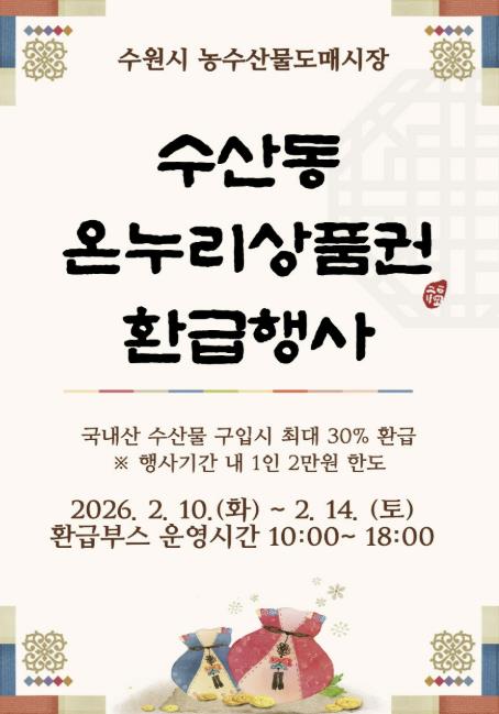 [뉴스앤톡] 수원시농수산물도매시장 수산동이 설을 맞아 2월 10일부터 14일까지 온누리상품권 환급 행사를 연다.