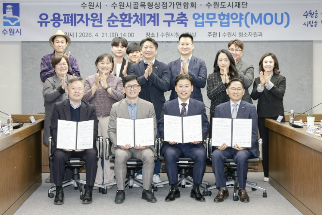 수원시는 21일 시청 상황실에서 수원시골목형상점가연합회, 수원도시공사, 수원도시재단과 ‘유용 폐자원 순환 체계 구축 업무협약’을 체결하고, 협력을 약속했다.