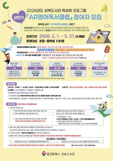 [뉴스앤톡] 용인특례시 성복도서관은 오는 16일부터 2026년 ‘AR(Accelerated Reader)영어독서클럽’ 상반기 참여자 100명을 모집한다고 15일 밝혔다.