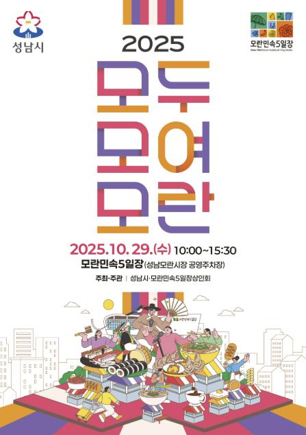 [뉴스앤톡] 성남시는 오는 10월 29일 오전 10시부터 오후 3시 30분까지 모란민속5일장(중원구 둔촌대로 68)에서 ‘2025 모두모여모란’ 축제를 연다.