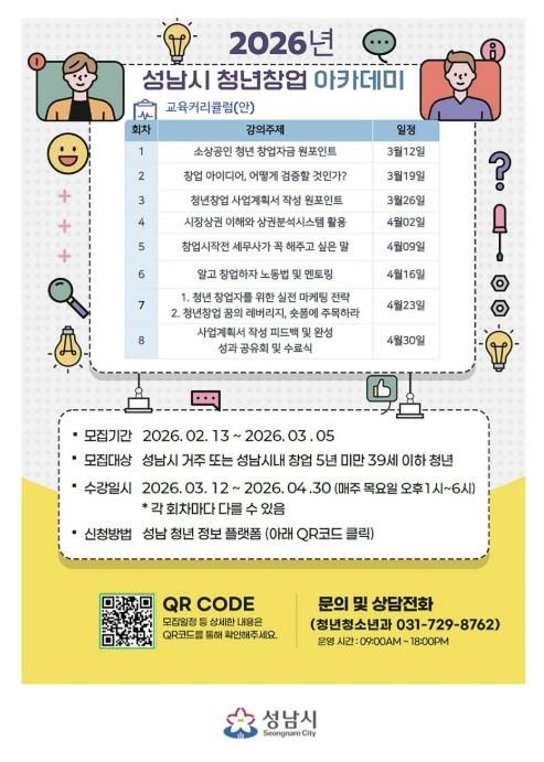 [뉴스앤톡] 성남시는 오는 3월 5일까지 ‘청년창업 아카데미’ 무료 교육생 30명을 모집한다.