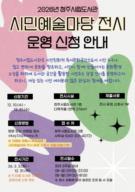 | ▲ 청주시립도서관, ‘2026 시민예술마당 전시’ 운영자 모집 |