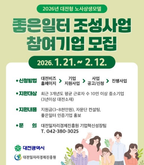 [뉴스앤톡] 대전시는 1월 21일부터 2월 12일까지 대전형 노사상생 모델‘2026년 좋은 일터 조성사업’에 참여할 12개 기업을 공개 모집한다.