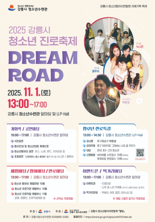 [뉴스앤톡] 강릉시 청소년수련관은 오는 11월 1일 오후 1시부터 5시까지 강릉시 청소년수련관 앞마당 및 유피홀에서 청소년들의 진로 탐색과 자율적 참여 확대를 위한 2025 강릉시 청소년 진로축제 'Dream Road'를 개최한다.