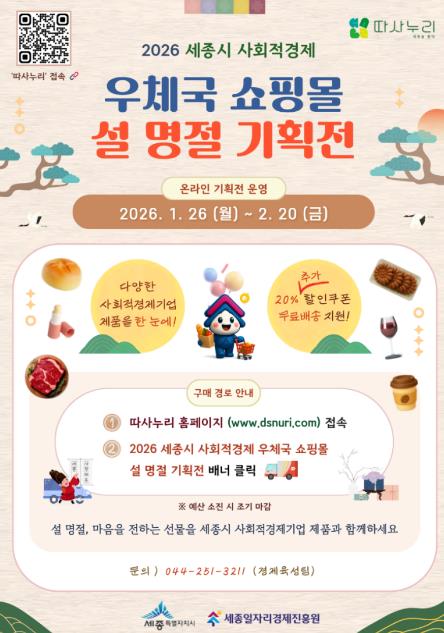 [뉴스앤톡] 세종일자리경제진흥원이 설 명절을 맞아 세종시 사회적경제기업의 온라인 판로 확대와 매출 증대를 위해 ‘2026년 세종시 사회적경제 우체국쇼핑몰 온라인 설 기획전’을 운영한다고 밝혔다.
