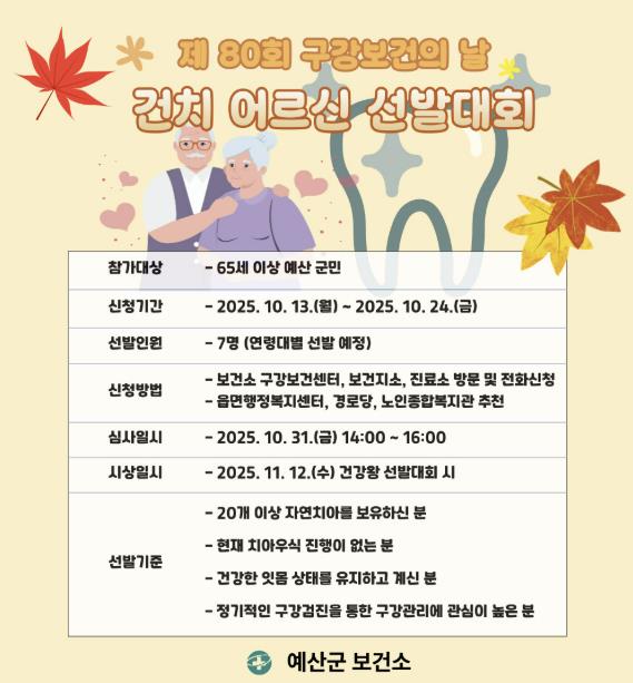 [뉴스앤톡] 예산군보건소는 ‘제80회 구강보건의 날’을 맞아 건강하고 활기찬 구강생활 실천 분위기 조성을 위해 건치(건강한 치아)어르신 선발대회를 개최한다.
