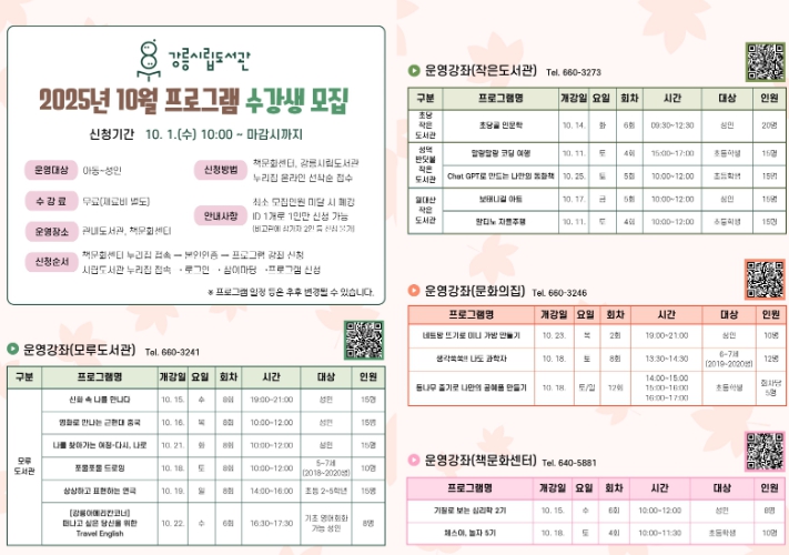 [뉴스앤톡] 강릉시립도서관은 오는 10월 1일부터 '2025년 10월 프로그램'에 참여할 수강생을 모집한다.