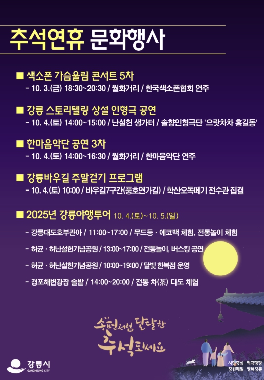 아울러 달빛따라 걷는 강릉야행투어가 4일부터 5일까지 강릉대도호부관아, 허균·허난설헌기념공원, 경포해변광장 솔밭에서 운영되며, 전통놀이와 절식 체험, 버블 공연과 퓨전 국악, MZ세대 버스킹 등 다양한 문화공연이 펼쳐진다.