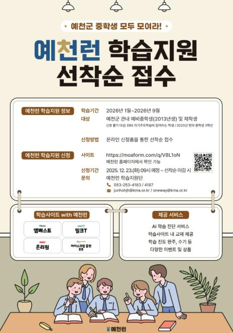 [뉴스앤톡] 예천군은 지역 청소년의 학습격차 해소와 자기주도학습 역량 강화를 위해 추진 중인 AI 기반 학습지원 사업 ‘예천런’에 참여할 예비 중학교 1학년 및 재학생을 추가 모집한다.