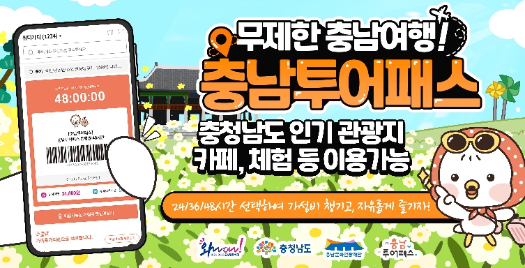 가격은 충남투어패스 통합권 △24시간권 1만 6900원 △36시간권 2만 1900원 △48시간권 2만 6900원이다.