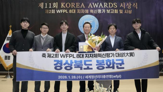 [뉴스앤톡] 봉화군이 세계청년리더총연맹(WFPL) 부설 지자체혁신평가위원회(GEC)가 주관한 ‘제2회 WFPL 8대 지자체 혁신평가’에서 기관 부문 최고 영예인 ‘대상(大賞)’을 수상했다.