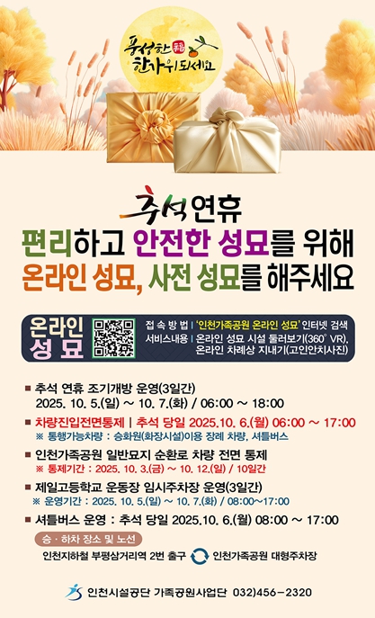 기타 차량 진입 통제 등 성묘 종합대책 관련 문의 사항은 인천시설공단 가족공원사업단으로 문의하면 된다.