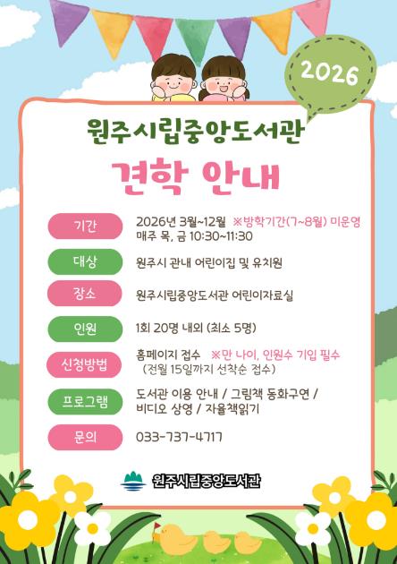 [뉴스앤톡] 원주시립중앙도서관은 오는 3월부터 12월까지 관내 유치원과 어린이집을 대상으로 도서관 견학 프로그램을 운영한다.