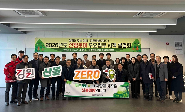 [뉴스앤톡] 강원특별자치도는 2월 11일 춘천시 소재 산림조합중앙회 강원지역본부에서 도 산림부서 및 시군 산림부서장 등 산림 관계자 70여 명이 참석한 가운데 ‘2026년 산림분야 주요업무 시책설명회’를 개최했다.