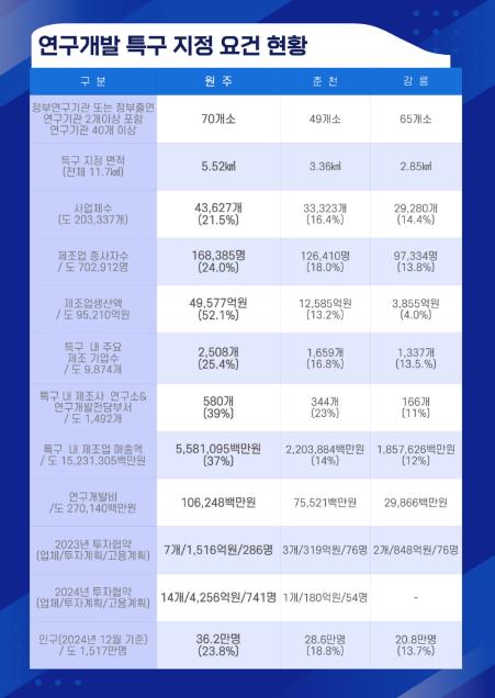 특구 지정 면적에서도 원주의 비중은 크다. 원주 지역 특구 면적은 5.52㎢로, 춘천·강릉을 포함한 전체 특구 면적 11.7㎢의 절반가량을 차지하고 있다.