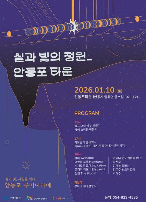 [뉴스앤톡] 안동포타운(다누림협동조합)은 경상북도와 경상북도문화관광공사가 추진하는 ‘2025년 3대문화 콘텐츠 확충 시범사업’에 선정됨에 따라, 2026년 1월 10일부터 2월 21일까지 안동포타운 일원에서 '실과 빛의 정원-안동포 루미나리에'를 운영한다고 밝혔다.