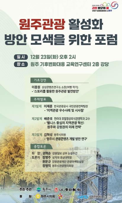 [뉴스앤톡] 원주시는 오는 23일 오후 2시, 기후변화대응교육연구센터 2층 대강당에서 ‘원주관광 활성화 방안 모색을 위한 포럼’을 개최한다.
