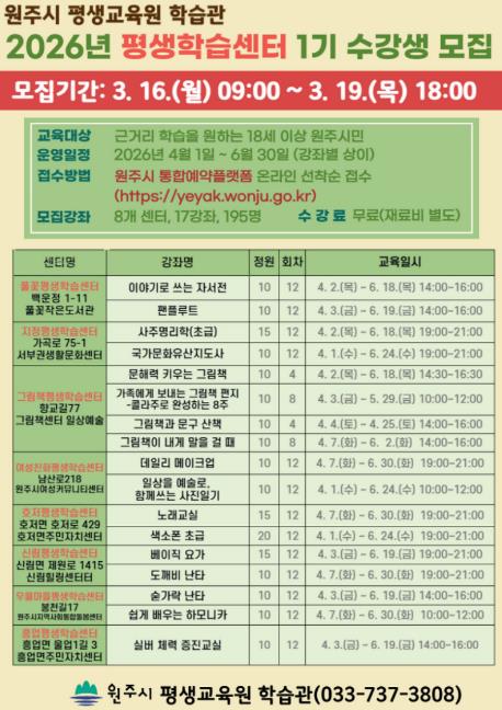 [뉴스앤톡] 원주시 평생교육원 학습관은 3월 16일부터 19일까지 2026년 평생학습센터 1기 수강생을 모집한다.