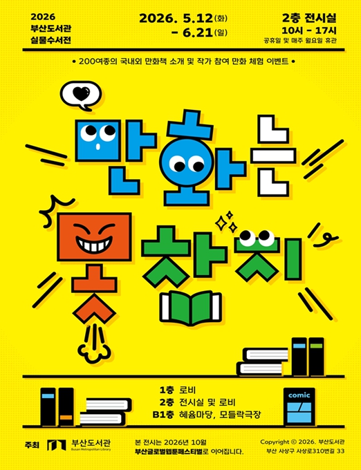 [뉴스앤톡] 부산도서관은 오는 5월 12일부터 6월 21일까지 만화와 웹툰의 매력을 시민들과 공유하는 '2026년 실물 수서전 '만화는 못 참지''를 개최한다고 밝혔다.