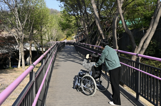 | ▲ 휠체어 이용객이 무장애 데크길을 이용해 진달래동산으로 이동하고 있다. |