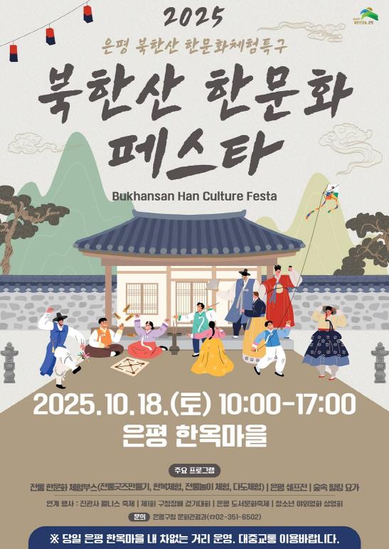 은평구 관계자는 “북한산 한문화 페스타는 전통과 현대가 어우러진 은평만의 매력을 담은 축제다”라며 “많은 주민과 관광객이 참여해 한문화체험특구를 함께 즐기며 은평의 문화적 가치를 발견하길 바란다”고 말했다.