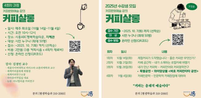 [뉴스앤톡] 시흥시는 민간주도형 지역축제 지원사업인 ‘2025년 시흥시 지역특화 관광축제 지원사업’에 선정된 ‘세계 커피콩 축제’의 사전 연계 프로그램으로 커피문화예술 특강 ‘커피살롱’을 오는 10월 14일부터 11월 4일까지 시흥ABC행복학습타운 지혜관에서 총 4회에 걸쳐 진행한다.