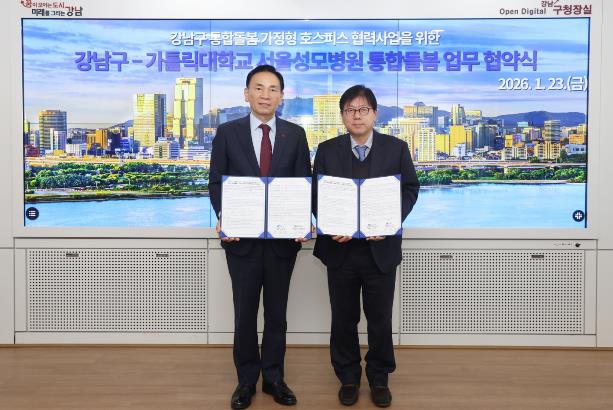 [뉴스앤톡] 꿈이 모이는 도시, 미래를 그리는 강남구가 1월 23일 구청에서 가톨릭대학교 서울성모병원과 ‘강남구 통합돌봄 가정형 호스피스 협력사업’ 추진을 위한 업무협약(MOU)을 체결했다. 이 협약은 자치구와 상급종합병원이 연계해 가정형 호스피스를 지원하는 체계를 공식화했다는 점에서 그 의미가 크다.