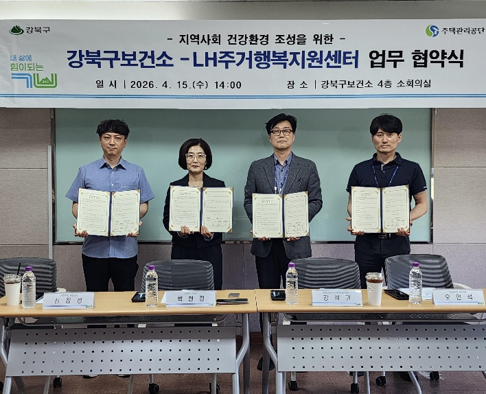 [뉴스앤톡] 서울 강북구는 지난 15일 강북구보건소에서 번동2·3·5단지 LH주거행복지원센터와 지역사회 건강환경 조성을 위한 업무협약(MOU)을 체결했다고 밝혔다.