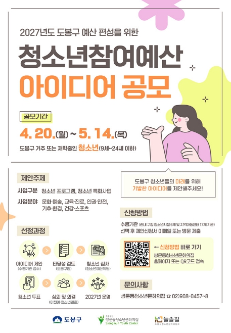 [뉴스앤톡] 서울 도봉구가 ‘청소년참여예산제’ 아이디어 공모를 오는 5월 14일까지 진행한다.