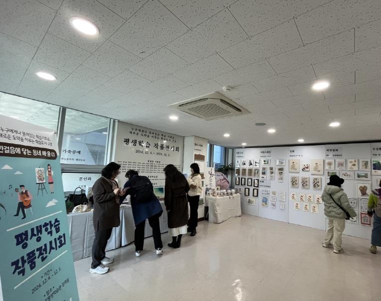 | ▲ 2024년 평생학습 작품전시회. 수강생들이 직접 만든 회화, 공예 등 다양한 작품이 전시돼 관람객의 관심을 끌고 있다 |