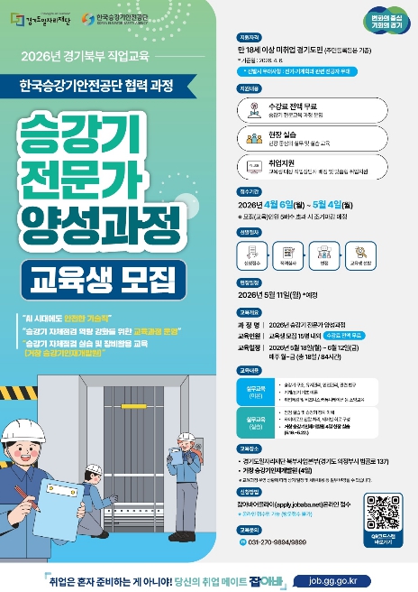 [뉴스앤톡] 경기도일자리재단은 승강기 전문 인력 양성을 통해 일자리 문제 해결과 지역경제 활성화를 추진하고자 ‘2026년 승강기 전문가 양성 과정’ 교육생을 모집한다고 21일 밝혔다.