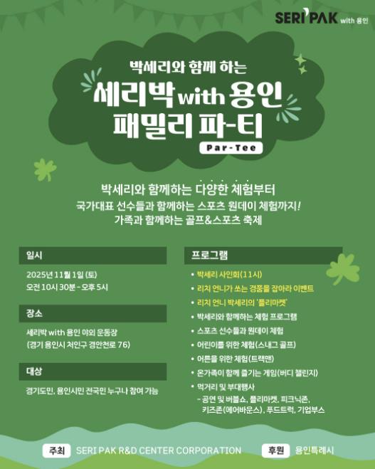 [뉴스앤톡] 용인특례시는 11월 1일 오전 10시 30분부터 오후 5시까지 처인구 경안천로 76에 위치한 ‘SERI PAK with 용인’ 야외운동장에서 골프 레전드 박세리 전 감독과 함께하는 ‘SERI PAK with 용인 패밀리 파티(Par-Tee)’를 개최한다고 21일 밝혔다.