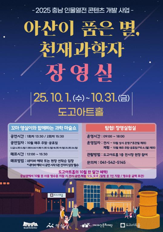 [뉴스앤톡] 아산문화재단이 운영하는 도고아트홀은 오는 10월 1일부터 31일까지 아산의 대표 역사 인물 장영실을 주제로 한 공연 및 전시·체험 프로그램을 선보인다. 이번 행사는 2025 충남 인물열전 콘텐츠 개발 사업의 일환으로 마련됐으며, 과학적 상상력과 문화예술을 결합한 콘텐츠로 기획됐다.