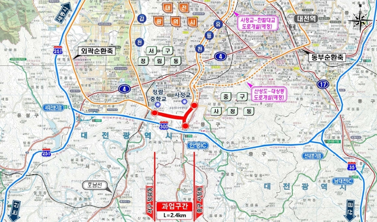 정림중~사정교간 도로개설은 교통 혼잡이 심한 국도 4호선 계백로(관저동~서대전네거리)의 교통량을 분산하기 위해 추진되는 사업으로, 총 연장 2.4km(터널 1개소·교량 3개소), 폭 20m, 왕복 4차선 규모로 개설된다.
