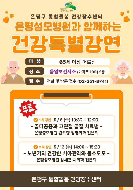 이번 강연은 은평구 통합돌봄 건강장수센터에서 진행되며, 노년기에 자주 발생하는 주요 질환의 예방과 관리를 주제로 2회에 걸쳐 진행된다. 은평성모병원 전문의가 직접 강의해 신뢰도 높은 건강 정보를 제공한다.