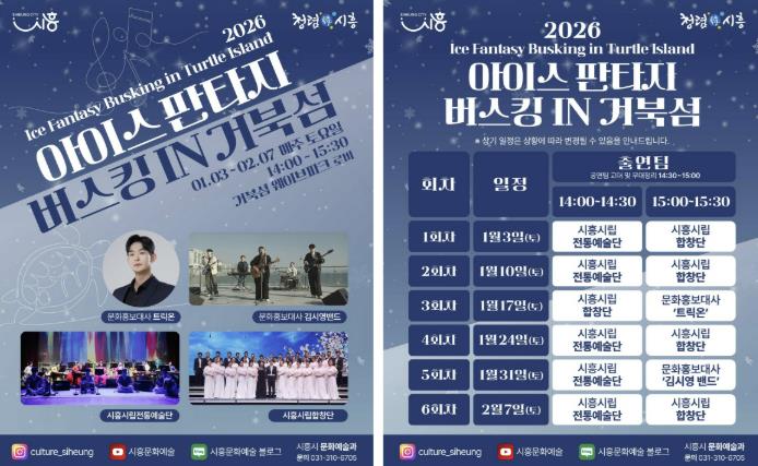 [뉴스앤톡] 시흥시는 지난 연말에 진행된 ‘2025 시흥 사운드 오브 윈터’의 열기를 잇는 후속 문화예술 프로그램으로, 겨울철 거북섬을 찾는 시민과 관광객에게 풍성한 즐길 거리를 제공하고자 ‘2026 아이스 판타지 버스킹 인 거북섬’을 운영한다.