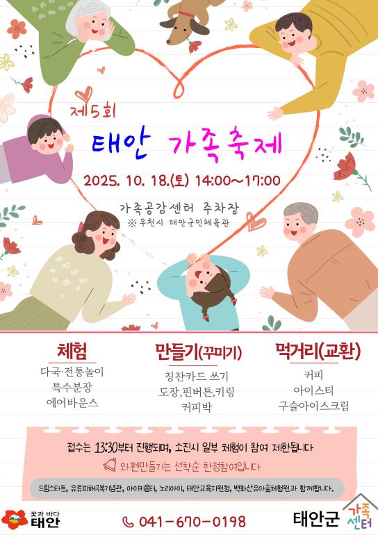 군은 오는 18일 오후 2시부터 태안군가족공감센터에서 각종 체험과 먹거리, 즐길거리가 있는 ‘제5회 태안가족 축제’를 연다고 밝히고 군민들의 많은 관심과 참여를 당부했다.