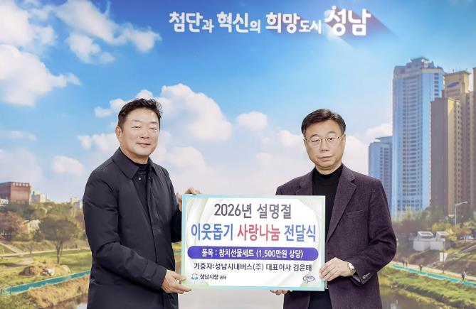 | ▲ 2026년 설명절 이웃돕기 사랑나눔 전달식에 참여하는 신상진성남시장과 김윤태 성남시내버스 대표이사 |