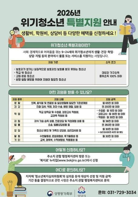 [뉴스앤톡] 성남시는 위기 청소년의 생활, 학업 등을 돕기 위한 특별지원 사업을 시행한다고 3일 밝혔다.