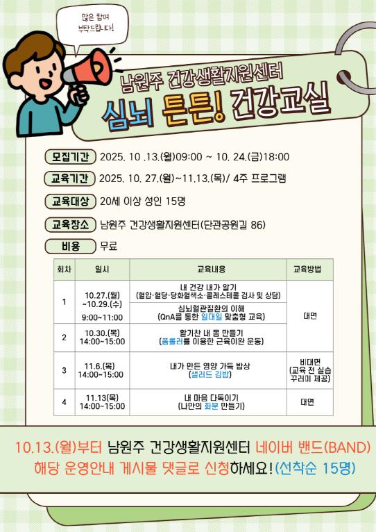 [뉴스앤톡] 남원주건강생활지원센터는 심뇌혈관질환의 이해·예방과 건강관리를 돕기 위해 10월 27일부터 11월 13일까지 ‘심뇌 튼튼! 건강교실’을 운영한다.