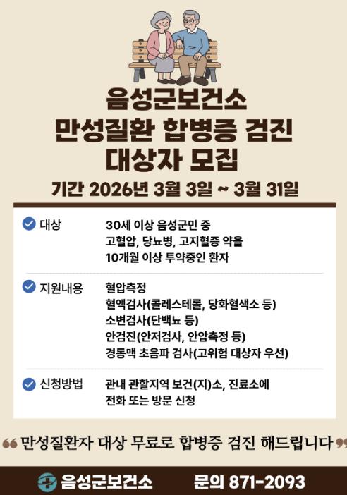 [뉴스앤톡] 음성군보건소는 만성질환자의 합병증을 조기에 발견하고 중증 심뇌혈관질환을 예방하기 위해 3월 3일부터 31일까지 ‘2026년 만성질환 합병증 검진 사업’ 대상자를 모집한다.