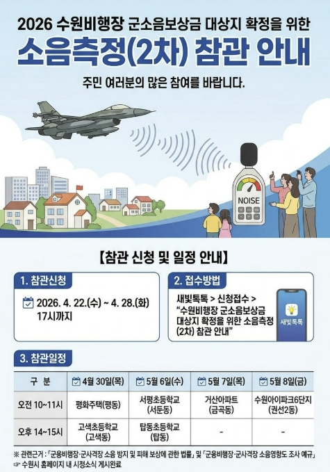 [뉴스앤톡] 수원특례시가 수원비행장 인근 주민들의 소음 피해 보상 근거가 될 국방부의 ‘수원비행장 소음 영향도 조사 2차 소음측정’ 주민 참관 참여자를 모집한다. 4월 28일까지 새빛톡톡으로 신청할 수 있다.