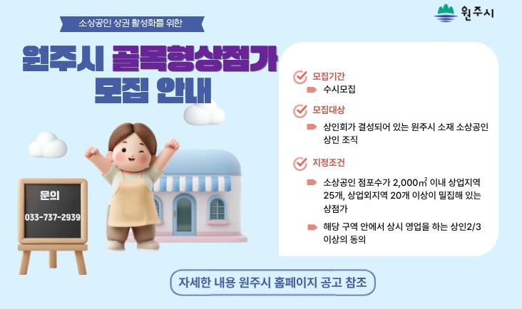 [뉴스앤톡] 원주시는 소상공인 상권 활성화를 위해 1월 26일부터 ‘원주시 골목형상점가’ 지정을 희망하는 상인 조직을 모집한다.