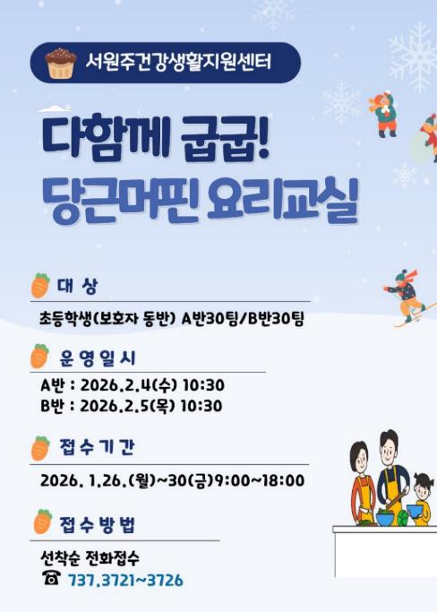 [뉴스앤톡] 서원주건강생활지원센터는 겨울방학 중 아이들의 올바른 식습관 형성을 돕기 위해 ‘다함께 굽굽! 당근머핀 요리교실’ 프로그램을 운영한다.
