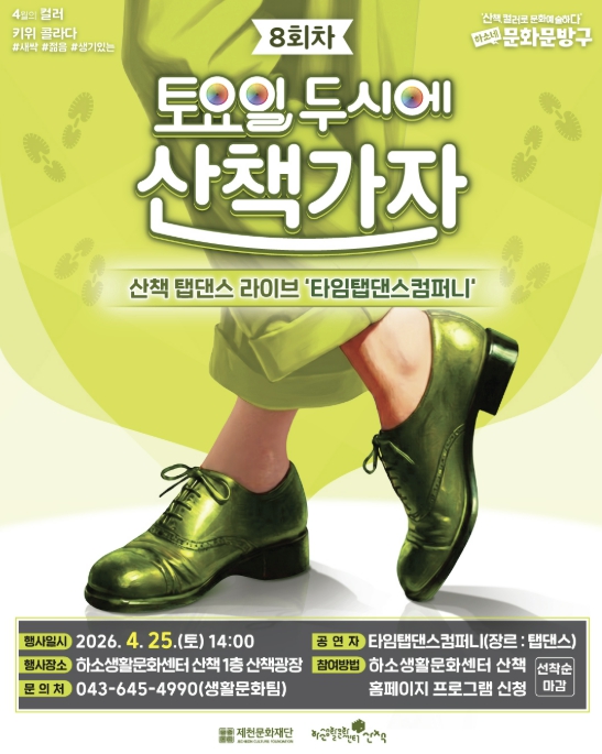 [뉴스앤톡] 제천문화재단이 운영하는 하소생활문화센터 ‘산책’에서 매주 토요일 시민들과 함께하는 문화예술 프로그램 '토요일 두시에 산책가자'의 여덟 번째 무대로 ‘탭댄스 공연’을 선보인다.