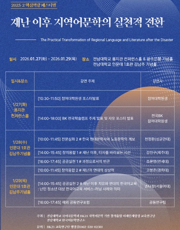 [뉴스앤톡] 전남대학교 국어국문학과 BK21 FOUR 교육연구단이 오는 1월 27일부터 29일까지 3일간 핵심역량페스티벌을 개최한다.