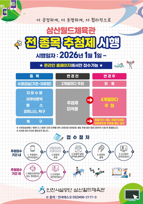 공단 관계자는 “추첨제 도입으로 접수 경쟁 완화와 많은 시민들에게 공정한 시설 이용 기회가 제공될 것으로 기대한다”라며 “추후 운영 상황에 따라 인천 시민 우선 접수 방안 검토 등 이용자 중심의 운영 개선 방안을 지속 추진하겠다”라고 밝혔다.