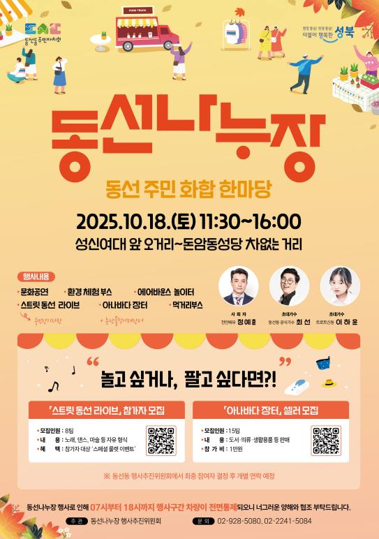 [뉴스앤톡] 서울 성북구가 오는 10월 18일 오전 11시 30분부터 오후 4시까지 성신여대 앞 오거리에서 돈암동성당 구간까지 이어지는 도로에서 ‘2025년 차 없는 거리 동선나누장’을 개최한다.